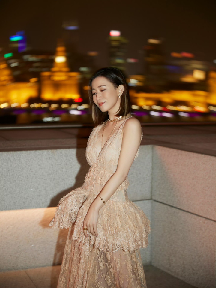 裸色蕾丝吊带裙重重叠叠,在夜风吹拂下轻晃,金饰点缀间愈发顺心。她闭眼微笑,港风的慵懒与娇媚扑面而来,像霓虹灯下的一抹柔光,流裸露闇练女性的风情。