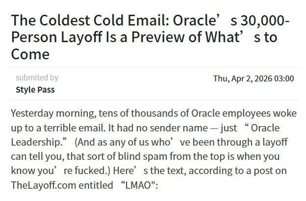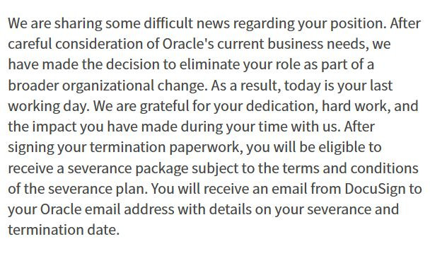 Oracle裁人邮件中最刺痛东谈主的处所,也许并不仅仅那句“今天就是你的临了一个使命日”。
