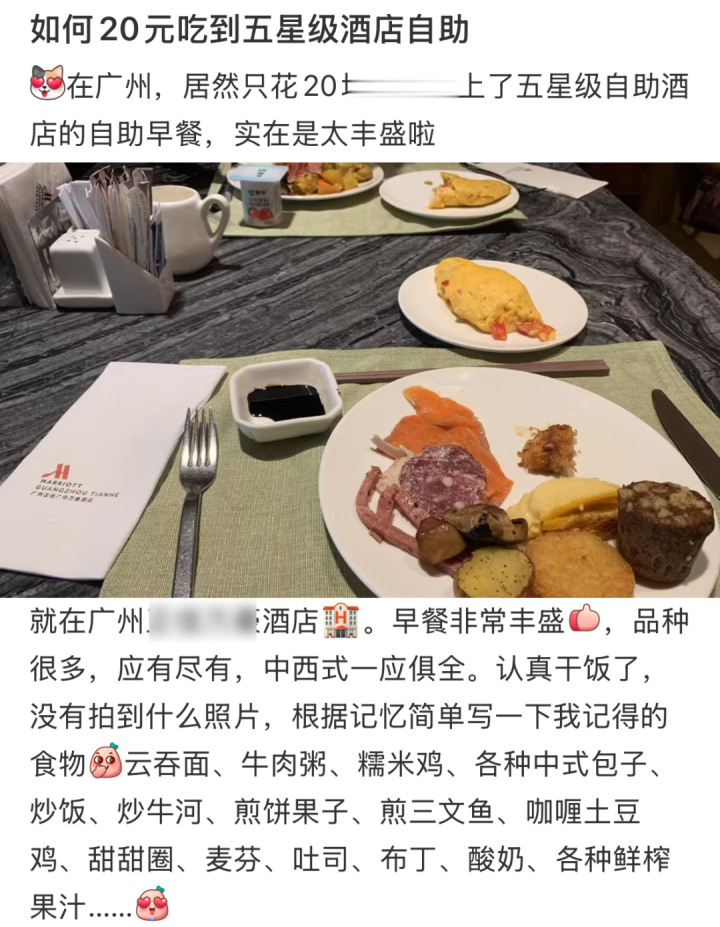 有东说念主还把五星级旅社的早餐成立出了更进阶的玩法:出门旅游时,就算住不起五星,也会成心买一次早餐自助。“因为在各地的五星级旅社里,自助早餐的特质小吃,可能比你我方去景点找来的网红店,更纯正可口。”