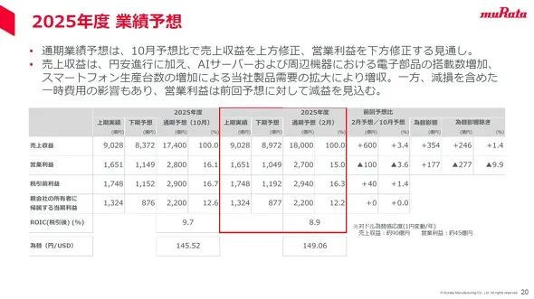 2025财年全年盈利预测已上调,销售额上调,营业利润下调。销售额因日元持续贬值,加之AI服务器及周边设备搭载量增加、智能手机产量提升带动需求扩大,上调600亿日元至1.8万亿日元。另一方面,受减值损失影响显著,营业利润下调100亿日元至2700亿日元。