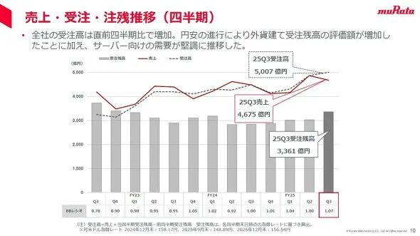 第三季度订单额为5007亿日元,环比有所增长,同比大增11.5%。其中电容订单额暴增29.4%至2681亿日元。BB值(订单额与销售额的比)为1.07,订单额略大于销售额,且连续5个季度高于“1”。