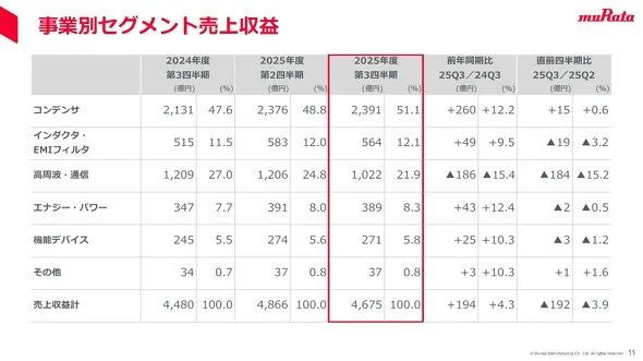 村田零组件部门(包含电容和电感/EMI滤波器)营收较去年同期成长11.7%至2955亿日元,其中,主力产品电容(以MLCC为主)营收增加12.2%至2391亿日元,电感/EMI滤波器营收增加9.5%至564亿日元。