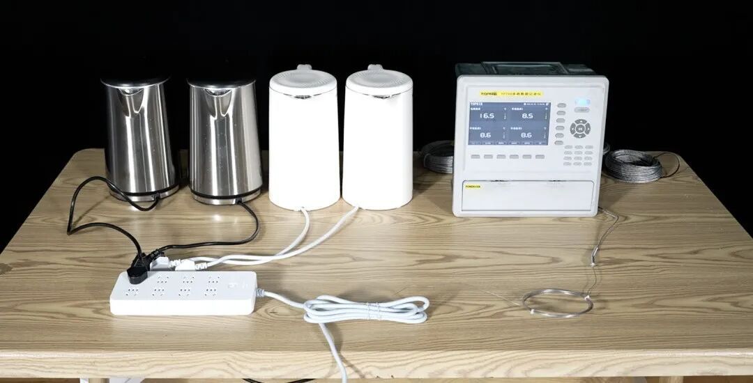 责任主说念主员将1台1800瓦的电热水壶插在国标插线板上,将电线用捆扎带绑在一说念。当电热水壶烧滚水自动断电时,测温仪清晰电线温度高潮至19.8℃。