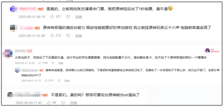 还有搞设计的网友声称,开着《原神》,CAD和渲染软件都老实了,不再莫名闪退,渲染还嘎嘎快。