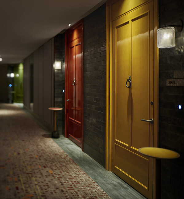 整体客房设计理念采用住宅风格,从走廊设计便突出了上海弄堂邻里中标志性的梧桐树剪影。每间客房的房门设计得各不相同,以强调居住氛围;室内设计则借鉴复式住宅的模式:独立式衣橱巧妙衔接卫浴空间,立体瓷砖墙面营造如家般的私密氛围。