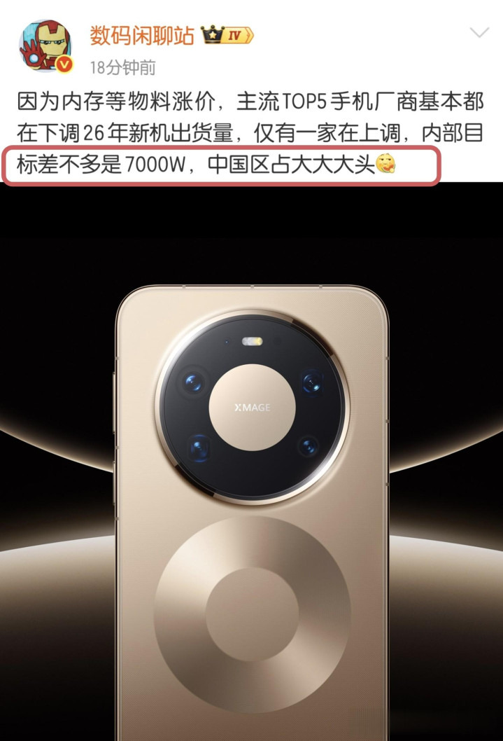 就在前几天,数码圈又爆了个料:因为内存、存储这些中枢物料加价,国内主流的TOP5手机厂商,基本皆不才气2026年的新机出货量,唯有华为逆势上调,里面主张定在了7000万台傍边。