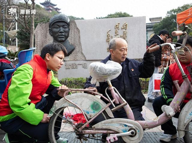 3月4日,孔胜东带着杭州市交通作事高档中学的学生在吴山广场开展自行车义修劳动。潮新闻记者汪驰超摄