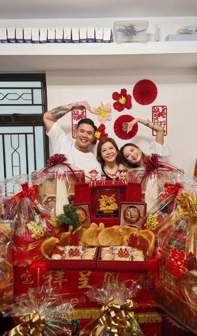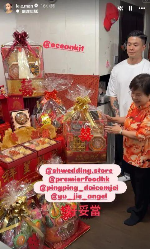李绮雯与独身夫Ocean站在堆积如山的聘礼后合照,简直被礼品挡住。