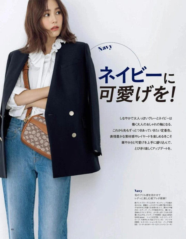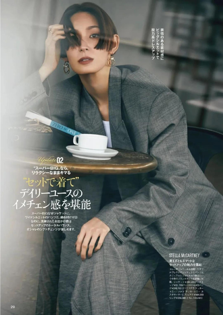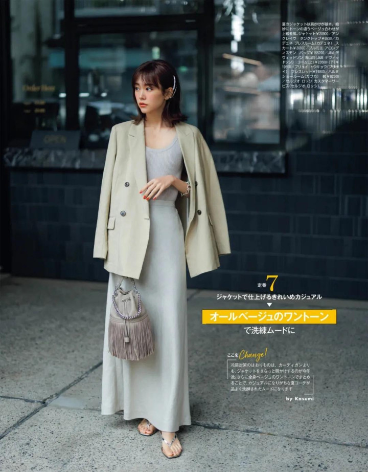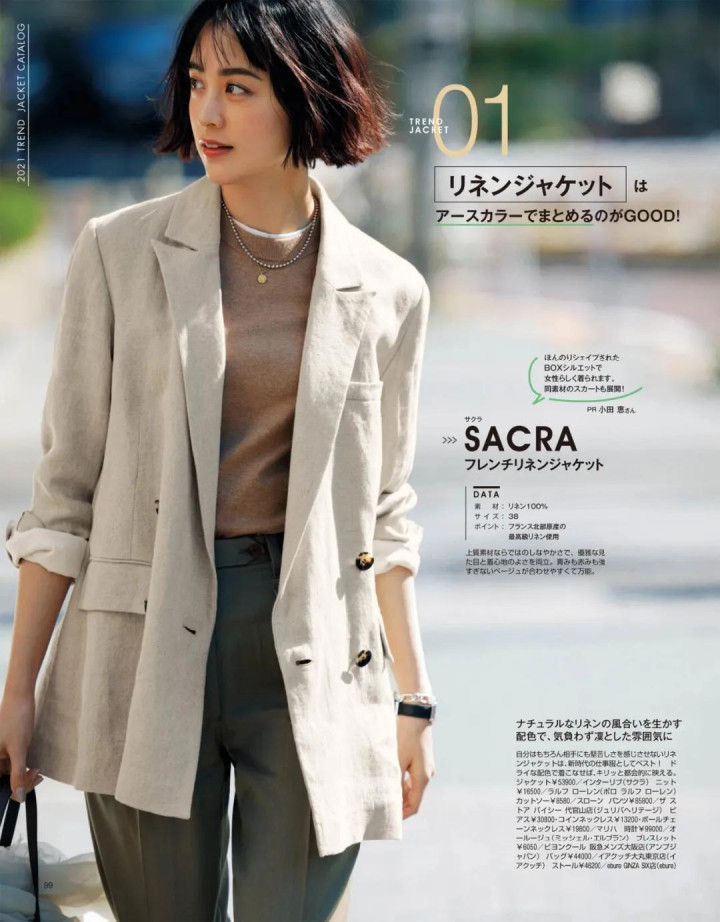 不要垫肩、不要过宽的,也不要亮面材质的,选那种微廓形的,肩线要落在天然的肩点上,后背不可有褶皱,袖长刚好能知道一小截腕骨。